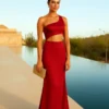 Osez l’élégance audacieuse avec notre robe longue asymétrique en satin rouge carmin, un modèle sensuel et raffiné qui attire tous les regards.