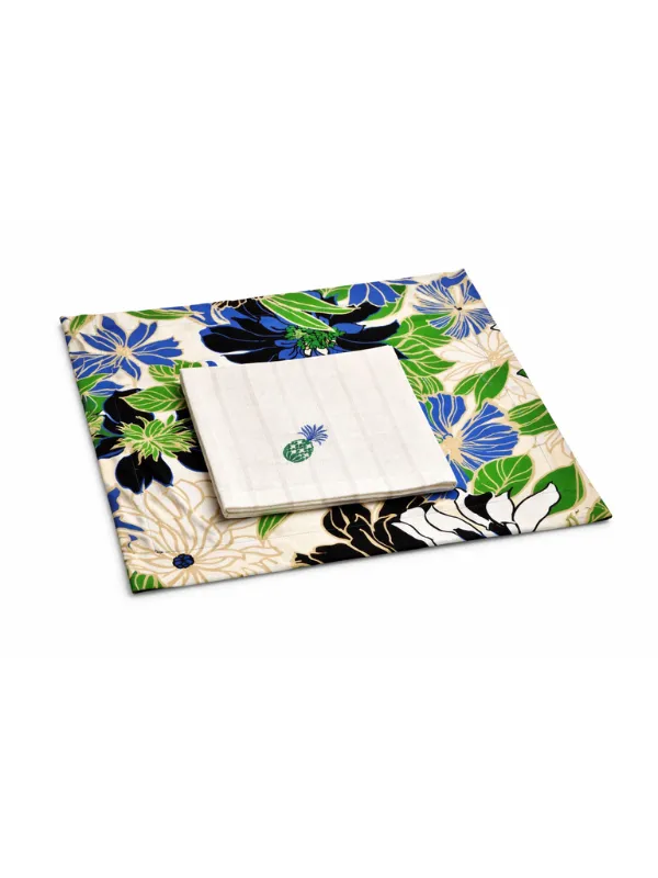 Ce set de table bleu intense avec un motif tropical accueille une serviette beige clair délicatement brodée d’un ananas.