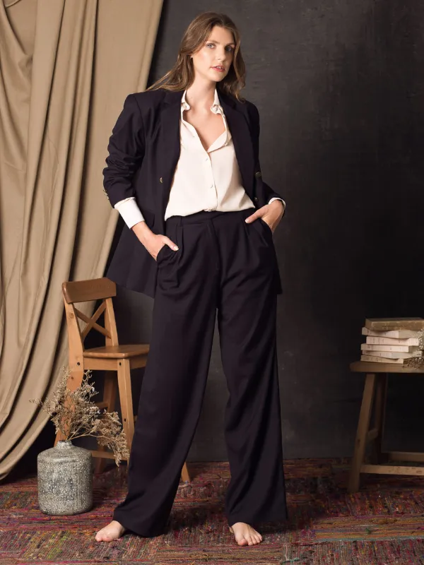 Pantalon fluide à taille haute. Jambes droites et larges. Plis marqués à l’avant. 2 poches sur les hanches et 2 poches passepoilées sur les fesses. Passants permettant de le ceinturer. Fermeture zip, crochet et bouton caché sous patte. Veste assortie pour compléter l’ensemble.