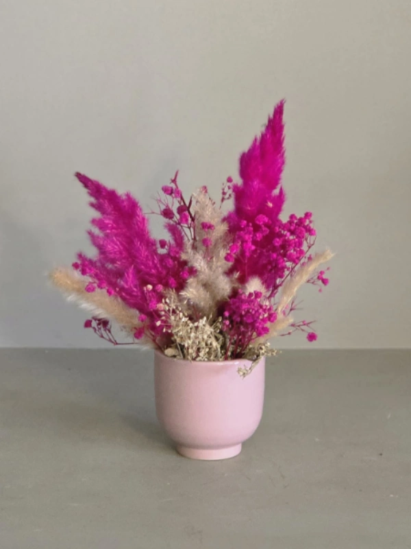 Mini pinky est une élégante composition de fleurs séchées alliant des nuances éclatantes de rose fuchsia et des tons naturels beige et blanc cassé.