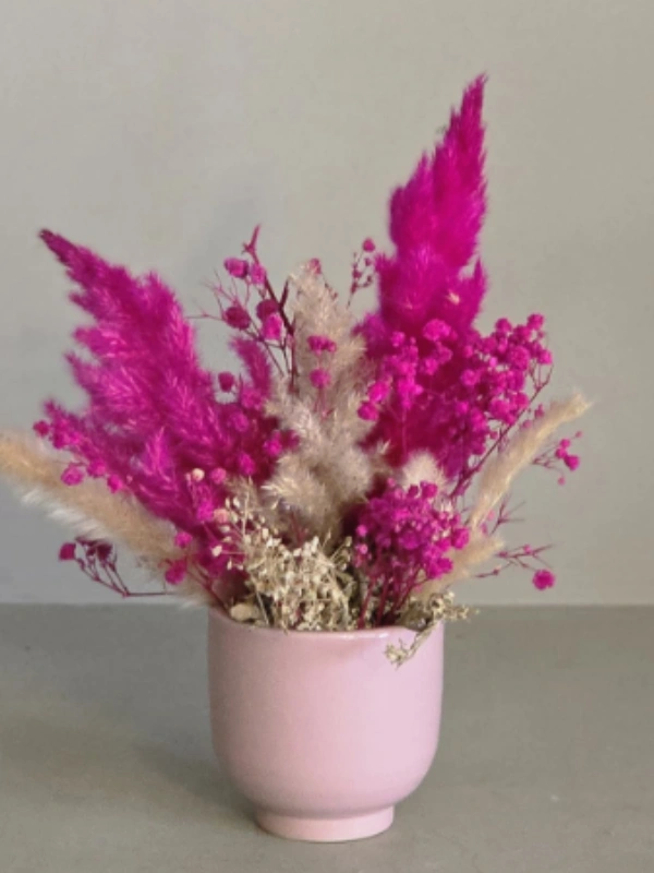 Un bouquet de fleurs séchées alliant éclat fuchsia et douceur naturelle pour une touche élégante et durable.