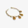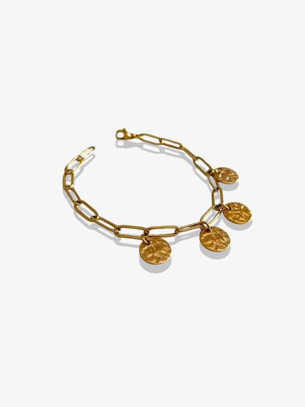 Ce bracelet est composé d’une chaîne dorée aux maillons allongés et de petits médaillons martelés.