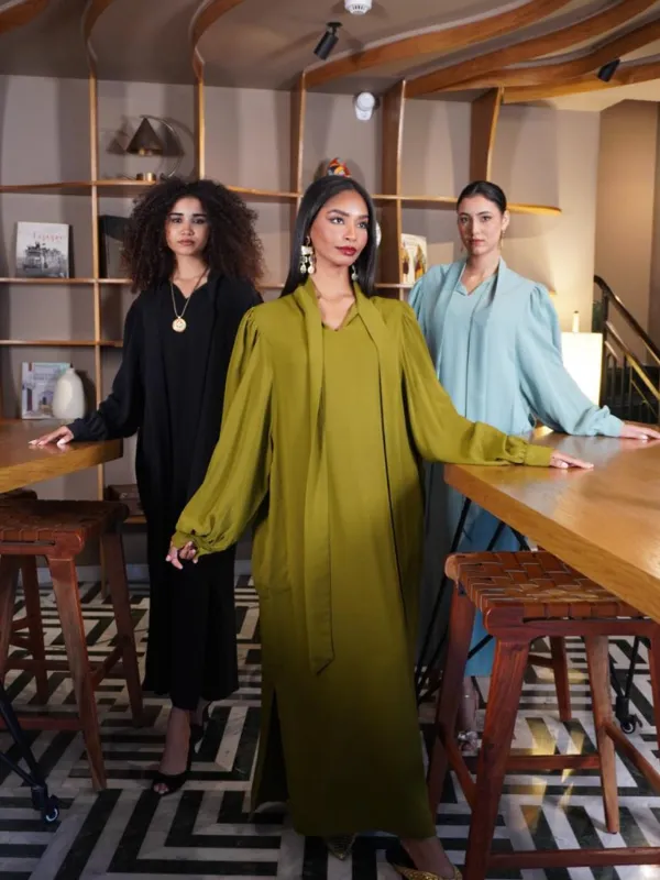 Magnifique caftan en crêpe, disponible en vert, bleu ciel et noir, élégant et raffiné.