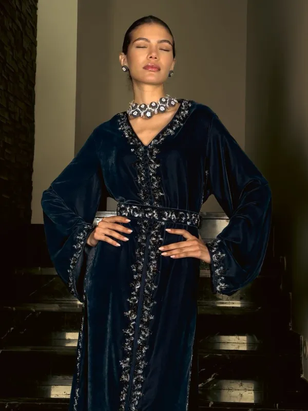 Caftan en velours brodé avec travail de maâlem, alliant élégance traditionnelle et finitions raffinées.