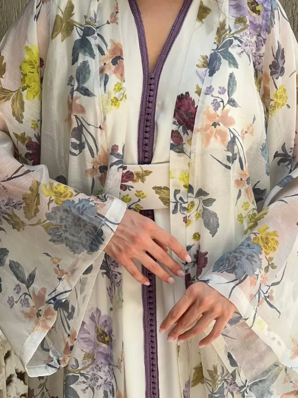 Caftan fleuri deux-pièces ; Manches transparentes et détails Sfifa et Akad.