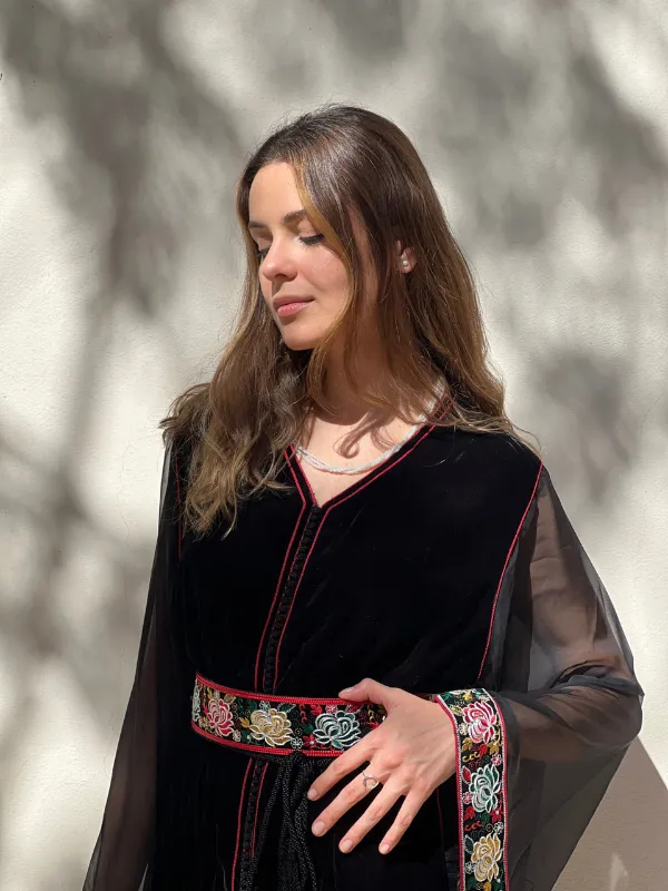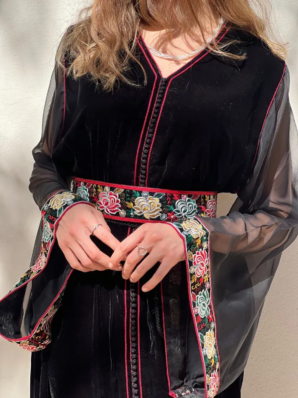 Caftan velours à manches en mousseline ; Galons brodés et Akidates.