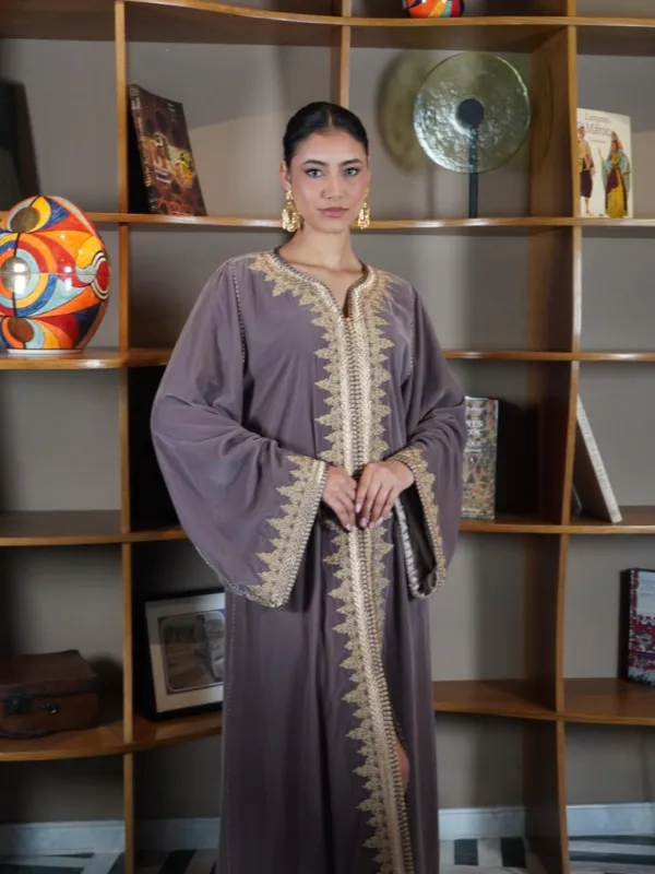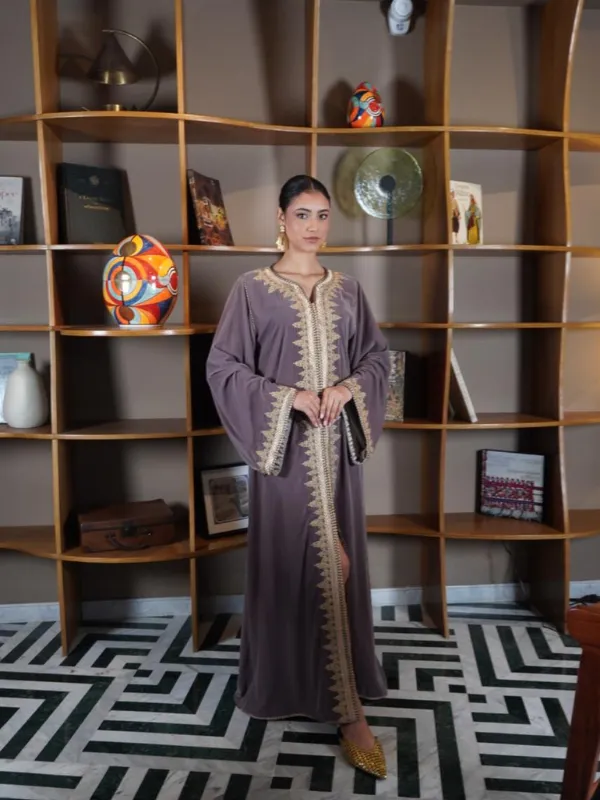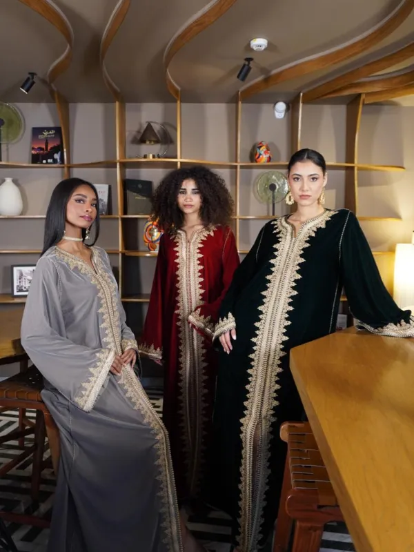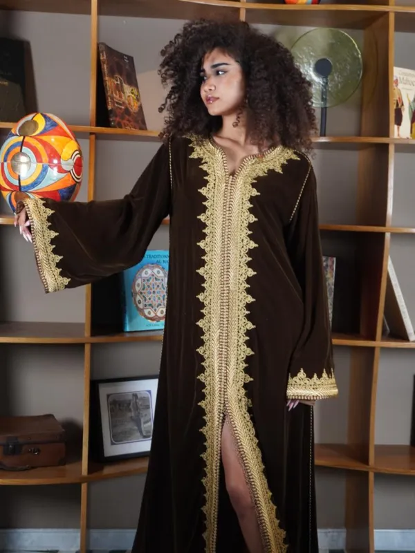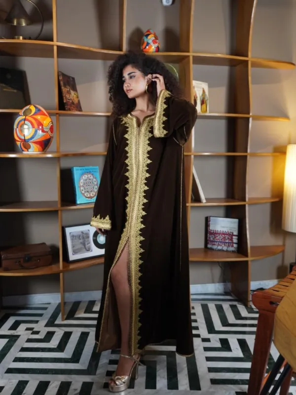 Caftan en velours avec broderie et travail de maâlem, alliant raffinement artisanal et élégance intemporelle.