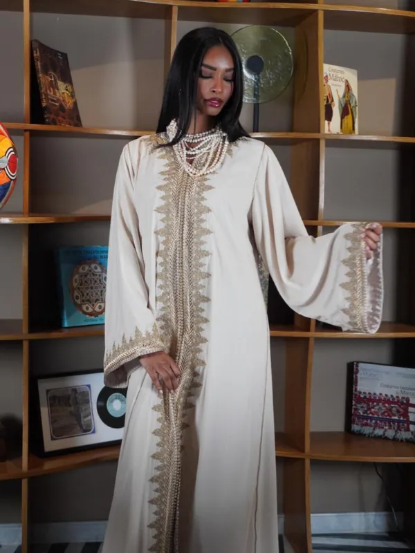 Ce caftan en velours se distingue par sa broderie délicate associée à un travail de maâlem, une technique traditionnelle qui apporte richesse et caractère à la tenue. Le velours, doux et profond, sublime la silhouette tandis que les finitions artisanales offrent une allure élégante et sophistiquée. Une pièce idéale pour les cérémonies, les soirées et les occasions spéciales.