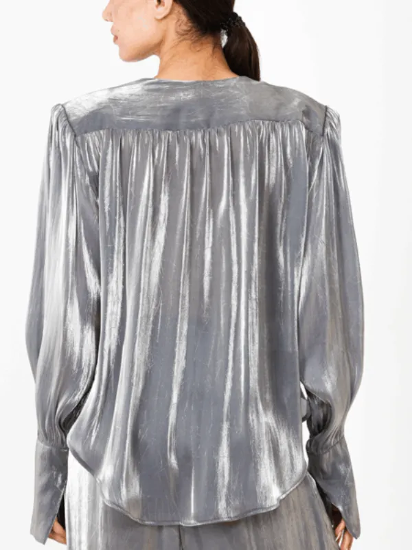 Avec ELVIRE, la blouse devient manifeste. Confectionnée dans un tissu léger aux reflets métallisés, sa coupe fluide s’illumine au moindre mouvement.