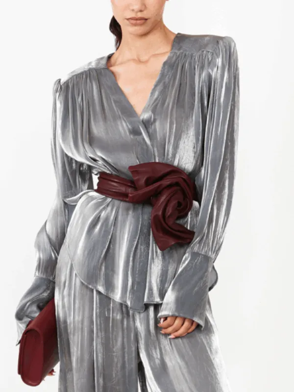 ELVIRE est un chemisier-sculpture. Épaules dessinées, lignes fluides, éclat métallisé : il revisite les classiques avec une aura rétro et magnétique.