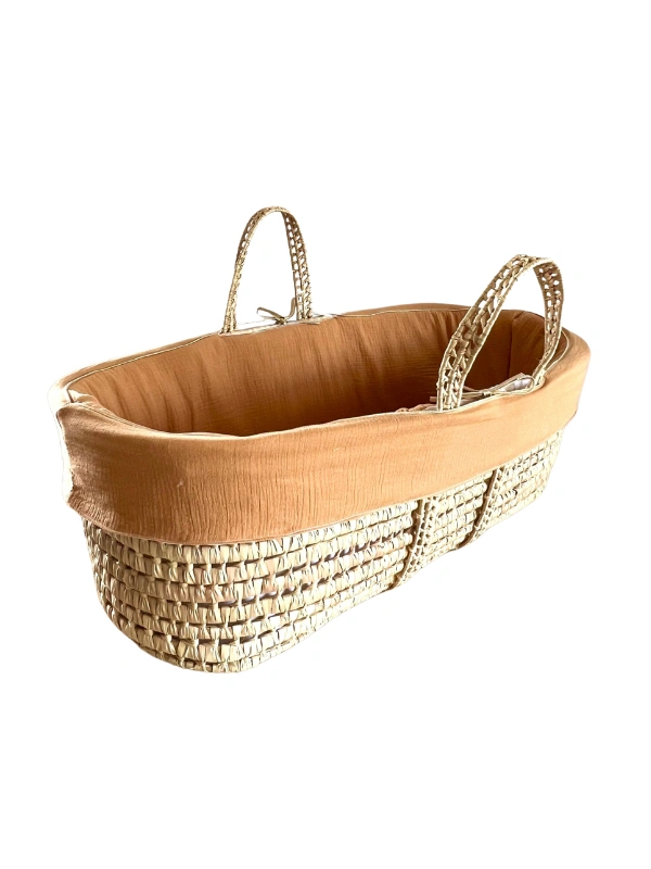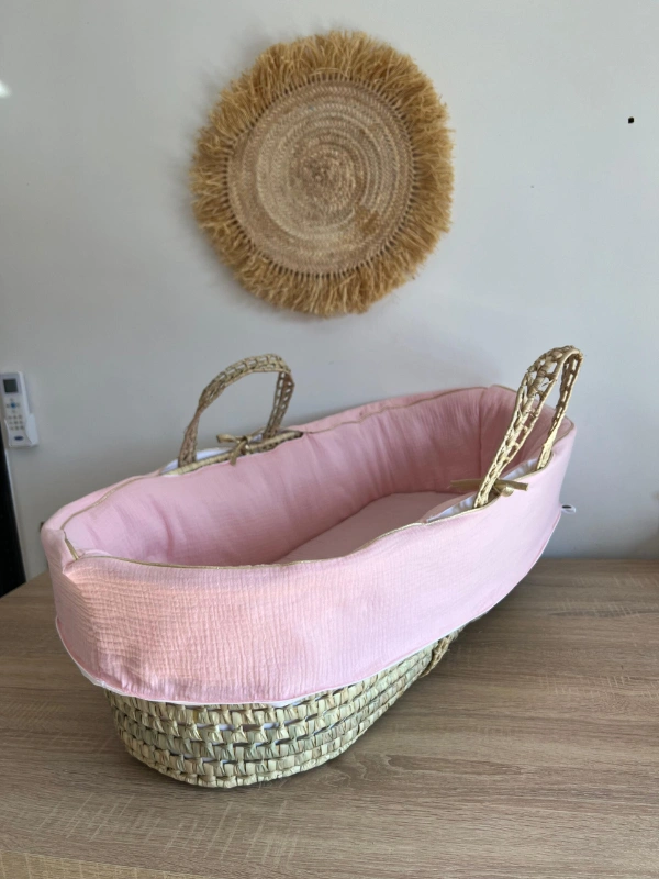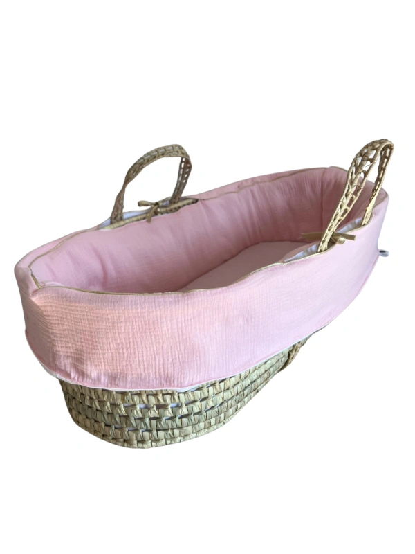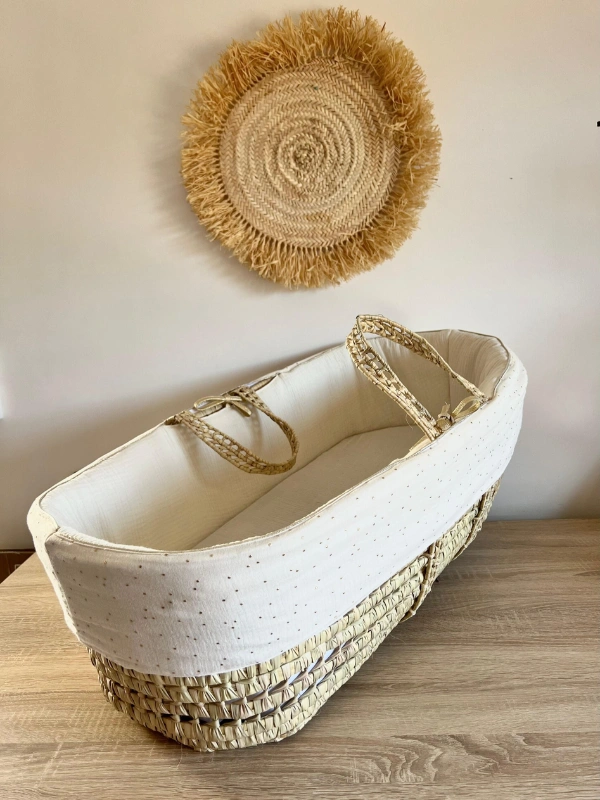 Couffin en palme tressée, avec habillage complet en double gaze de coton.