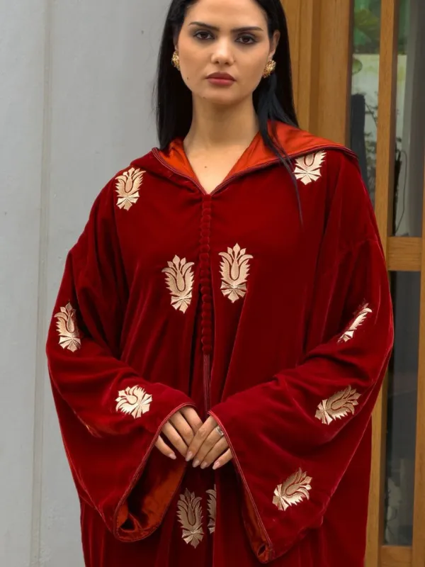 Djellaba en velours rouge brodée, élégante et raffinée, offrant un toucher doux et une allure sophistiquée.