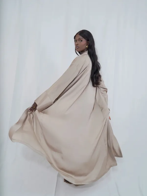 Le kimono à manches larges se noue délicatement à la taille grâce à sa ceinture ton sur ton, créant une silhouette équilibrée et gracieuse.