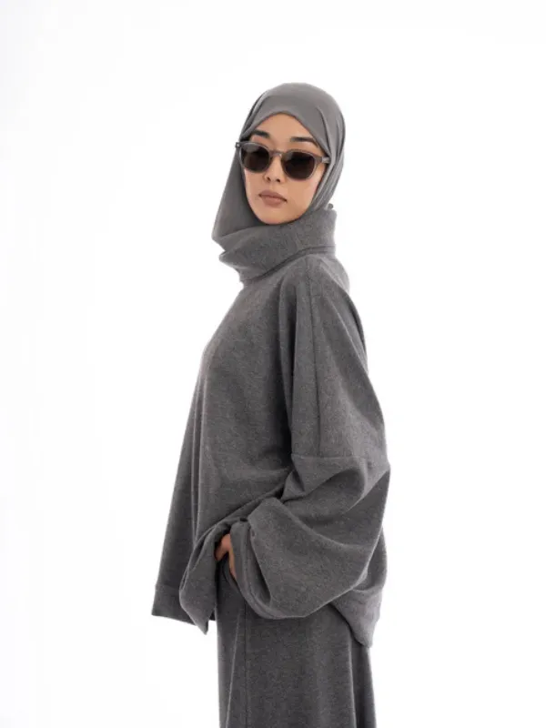 Le haut présente une coupe trapèze légèrement oversize, des manches longues amples et des finitions nettes, assurant une couvrance complète.