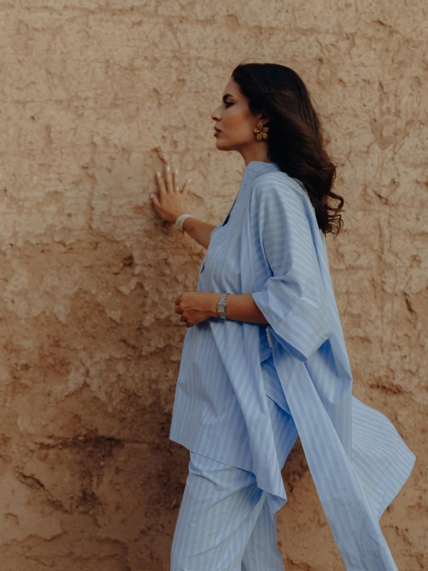 Un ensemble élégant de 2 pièces comprenant une chemise oversize à manches courtes avec un col rond et des Akaads faits à la main sur les manches. Le pantalon assorti est doté d’une taille élastique pour un ajustement confortable. Ensemble Azur Merinide Signature