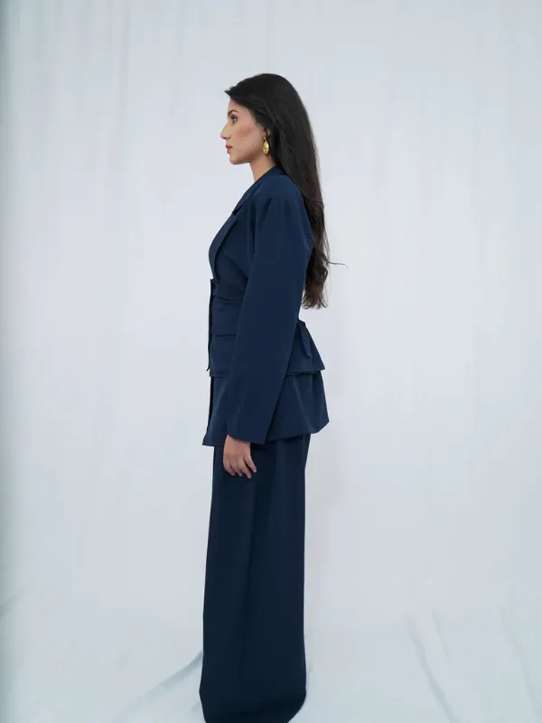 Le bustier structure la taille et redéfinit le blazer, apportant une touche contemporaine et féminine à l’ensemble.