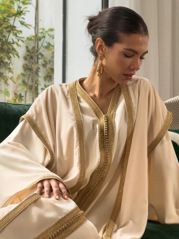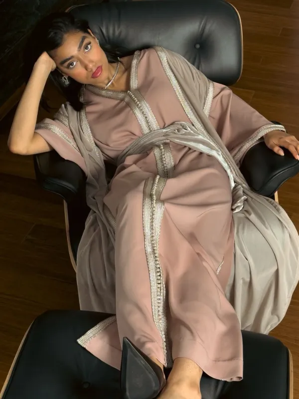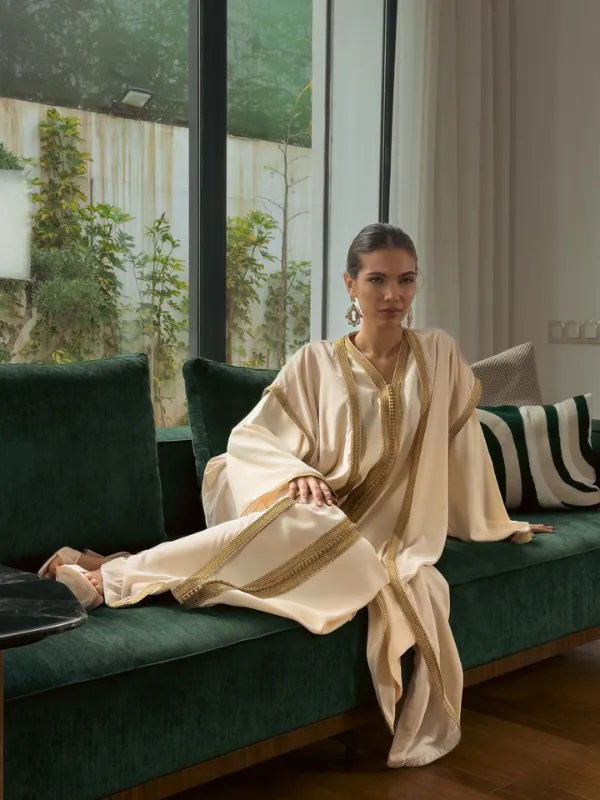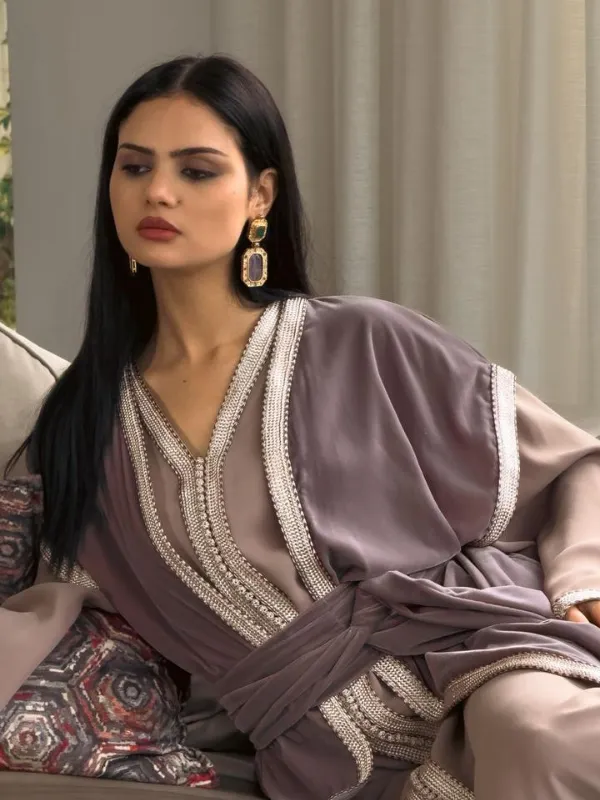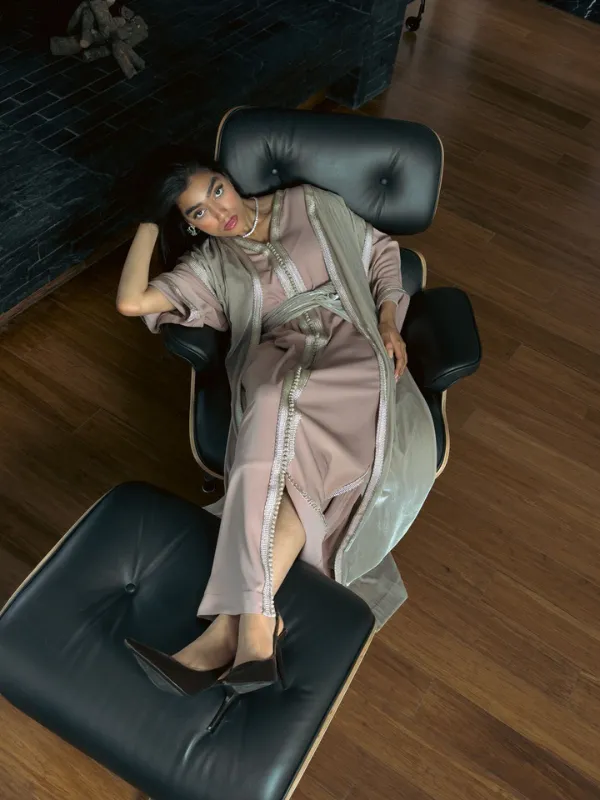 Ensemble raffiné composé d’un gilet long en velours et d’un caftan en crêpe, tous deux sublimés par un travail de maâlem. Une alliance élégante entre tradition et modernité.