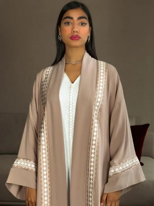 Ensemble kimono brodé et caftan confectionnés en crêpe, alliant élégance et fluidité. Une tenue raffinée, idéale pour les occasions spéciales.