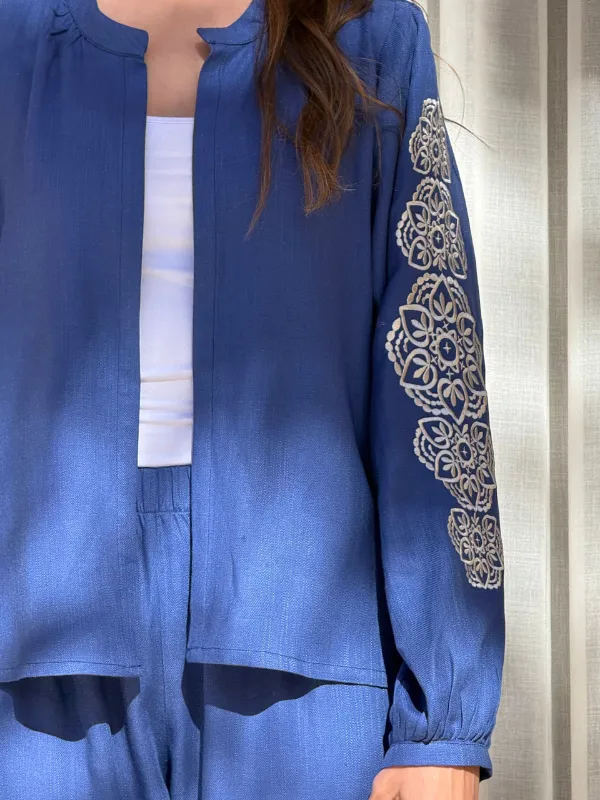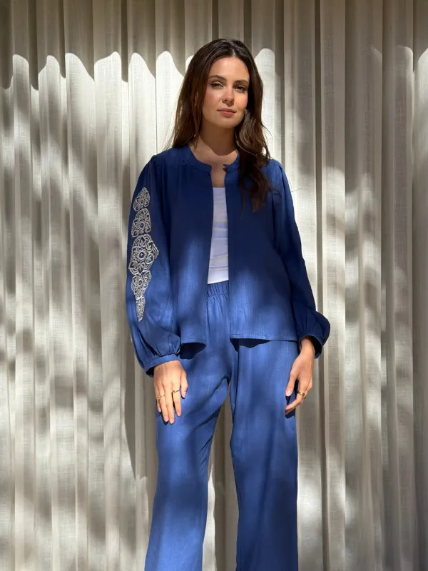 Ensemble Lin Chemise & Pantalon à Manches Bouffantes Brodées.