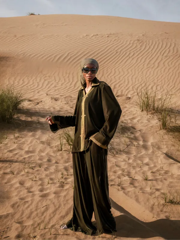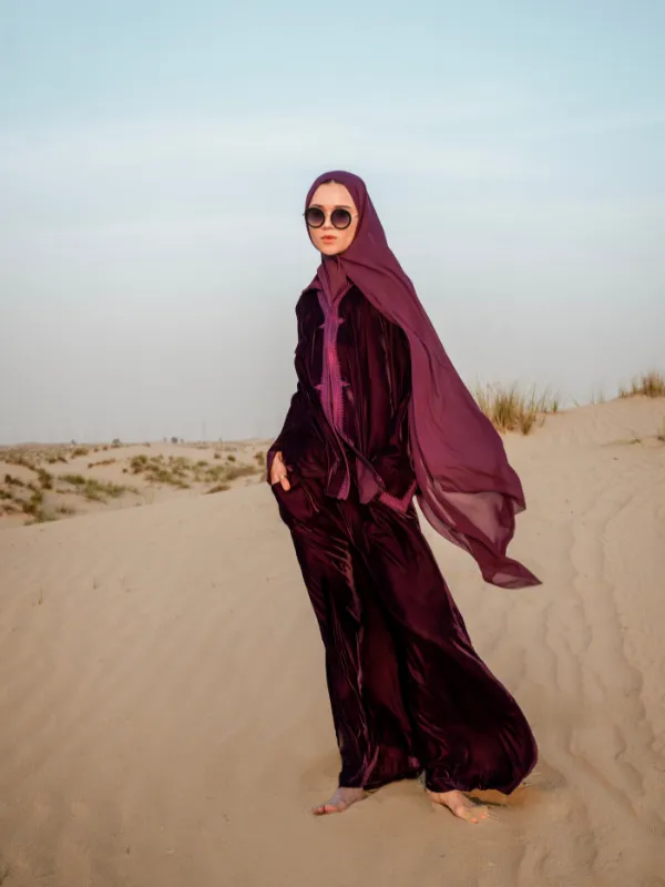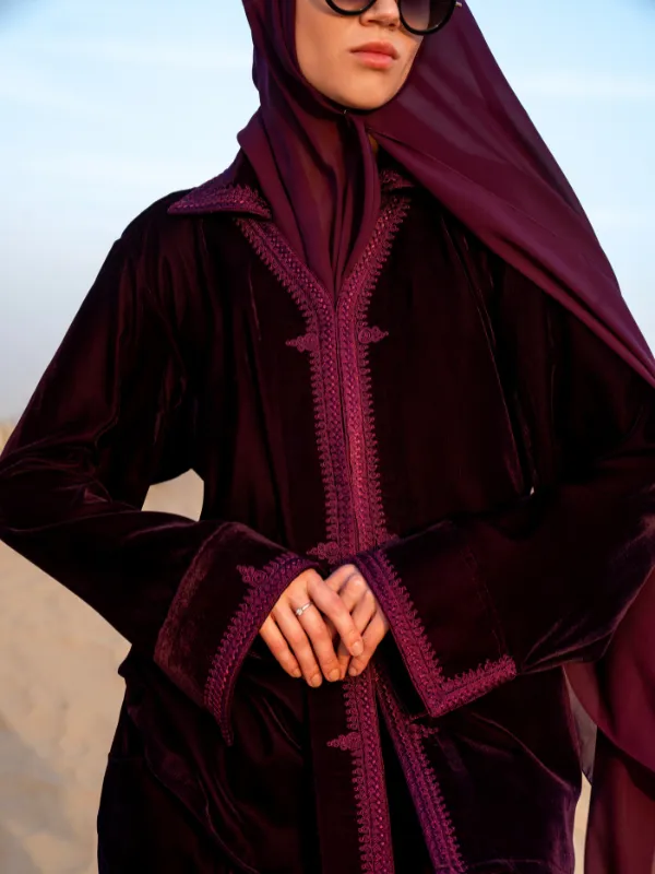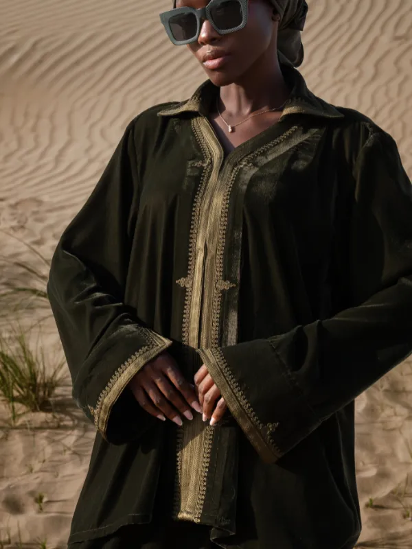 Ensemble deux pièces en velours léger et doux, composé d’un haut légèrement évasé à col avec sfifa et broderie centrale.