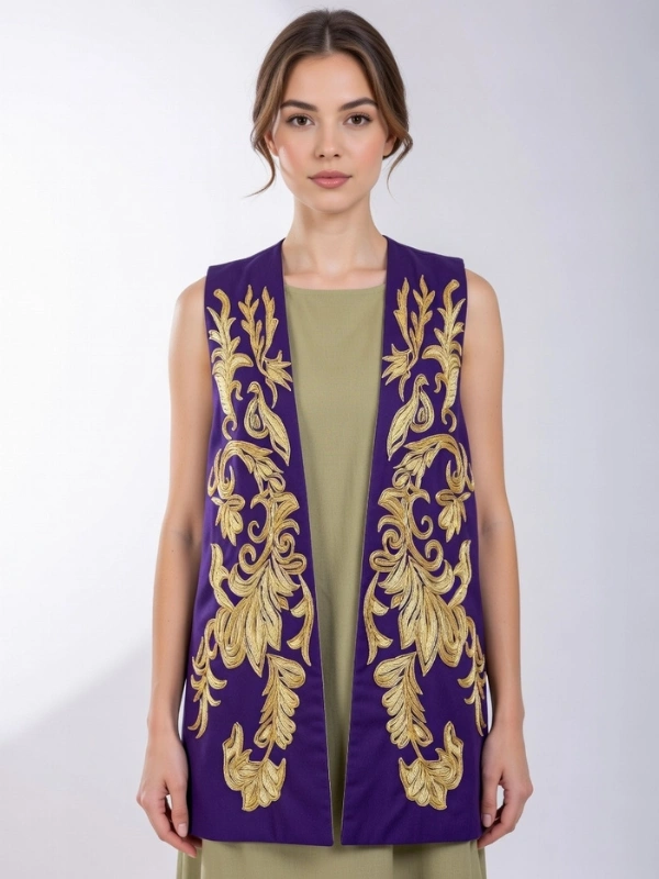 Pièce iconique de la collection Orzane. Gilet entièrement brodé sans manches, une pièce qui élève n’importe quelle tenue.