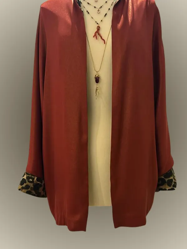 Veste oversize style haori en lamé rouge métallisé, contrastée par un revers et un col intérieur en imprimé léopard. Sa coupe ample et brillante offre un look audacieux, mélangeant esprit glamour et touche sauvage. Portée avec un jean, elle modernise et électrise la silhouette. Haori Lamé Leopard Magenta Atelier
