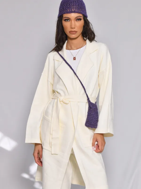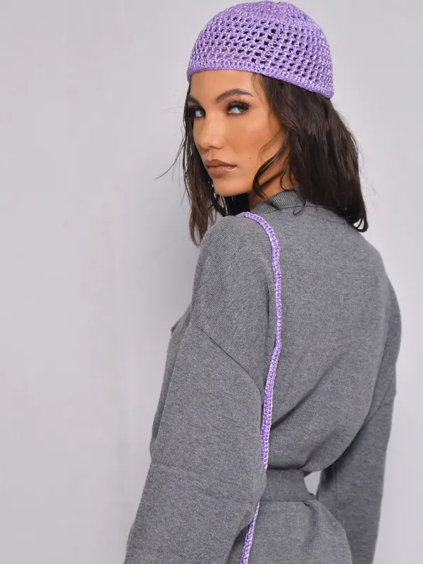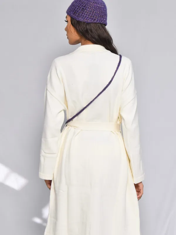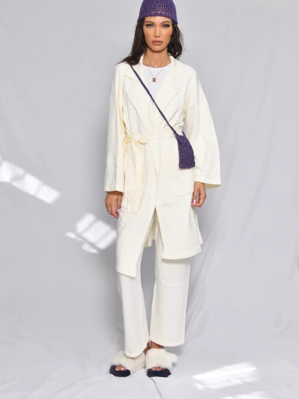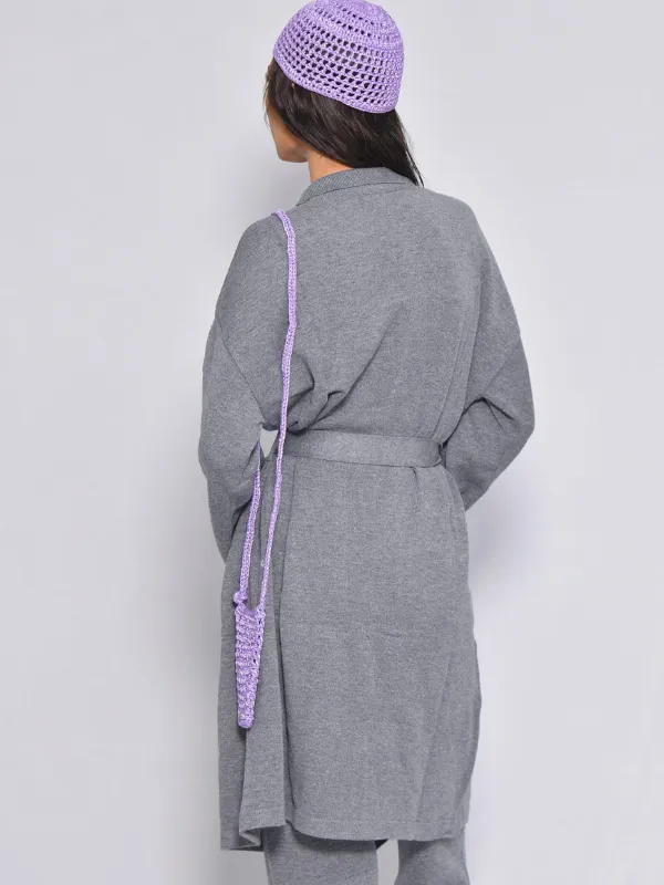 HAZEL est un ensemble en maille douce composé d’un cardigan long à nouer et d’un pantalon fluide.