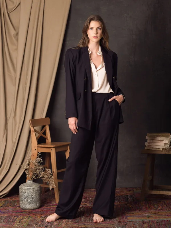 Veste tailleur à double boutonnage sur le devant. Deux poches à rabat sur le devant. Boutonnage en bas de manche. Fente en bas du dos. Doublée. Pantalon assorti disponible pour compléter l’ensemble.