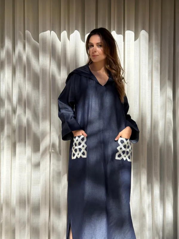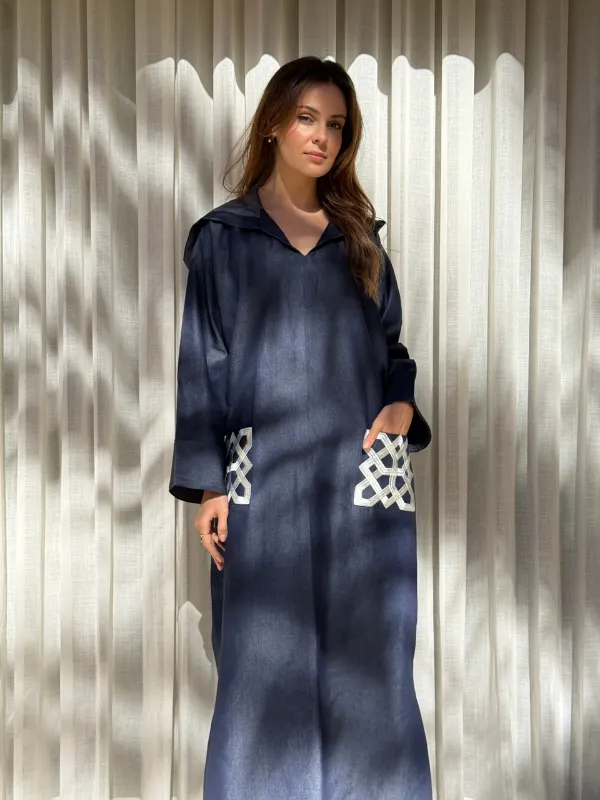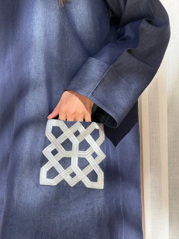 Jellaba en jean, au qob oversized et aux poches brodées, qui apportent caractère et originalité à la pièce.