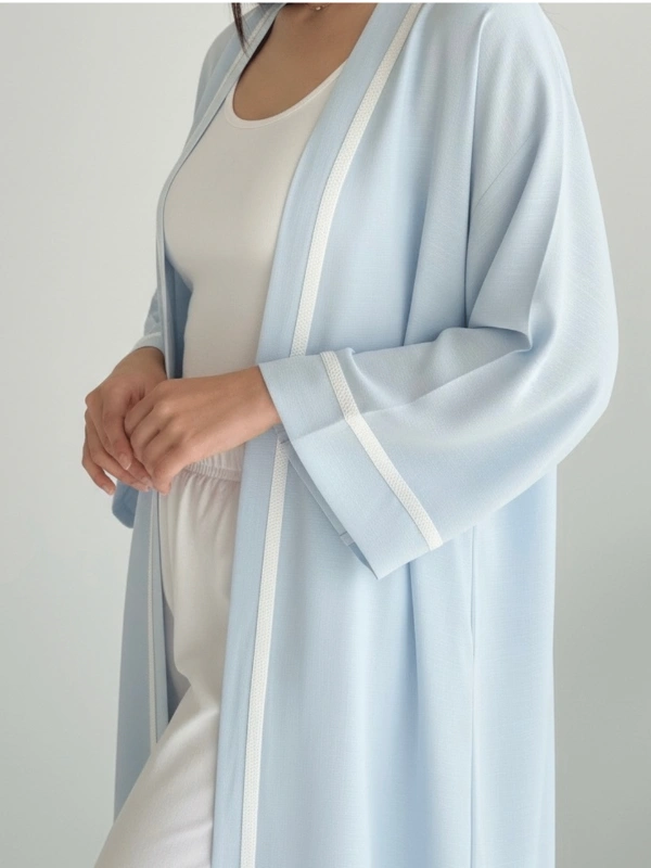 Kimono bleu ciel se distingue par sa matière légère et ses finitions raffinées. Les bordures sont ornées de sfifa marocaine blanche. Facile à associer, il se porte aussi bien sur une tenue habillée que sur un look décontracté.