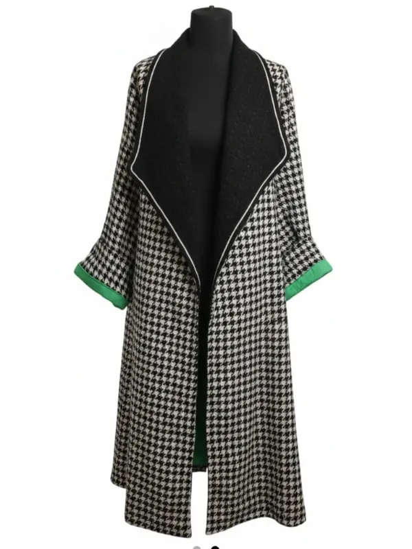 Kimono haute couture en tweed pied-de-poule blanc & noir, subtilement illuminé de fils d’argent.