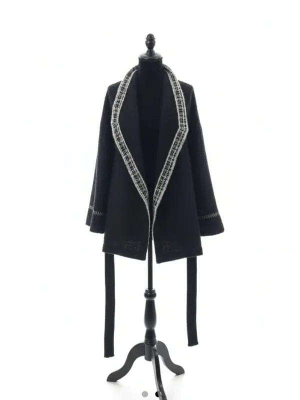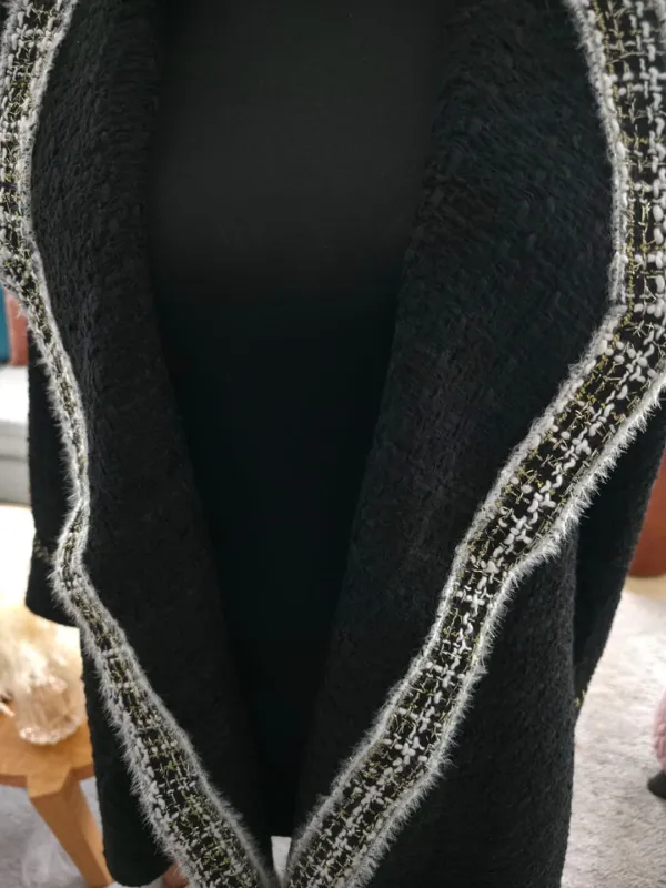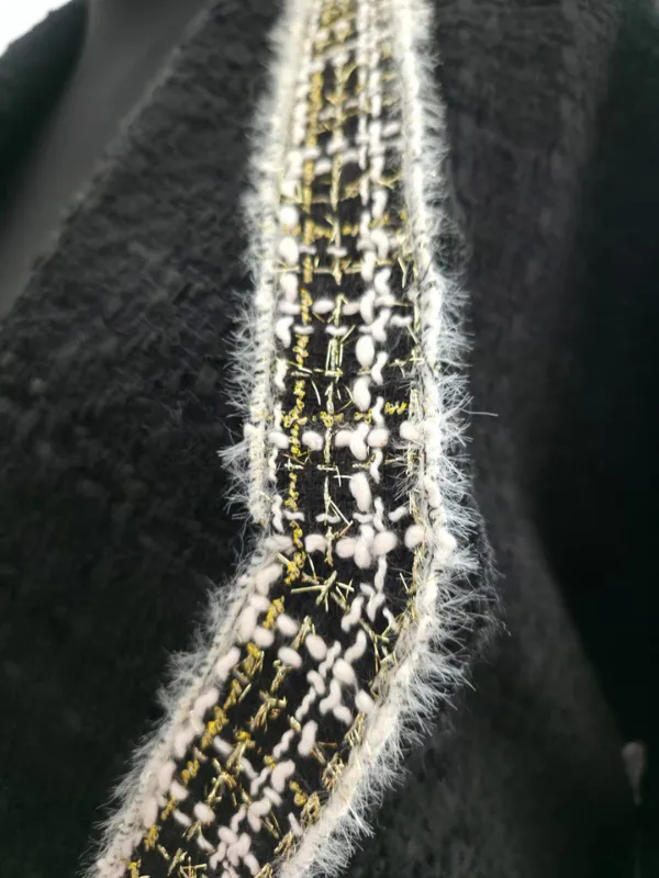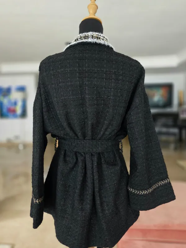 Kimono en tweed noir lainage à la coupe structurée et élégante. Sublimé par une finition tissée couture aux accents iconiques, il incarne un équilibre parfait entre modernité et héritage haute couture.