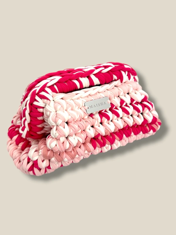 Un clutch vibrant et délicat, crocheté à la main dans un camaïeu de rose — une touche féminine et solaire pour toutes vos tenues.
