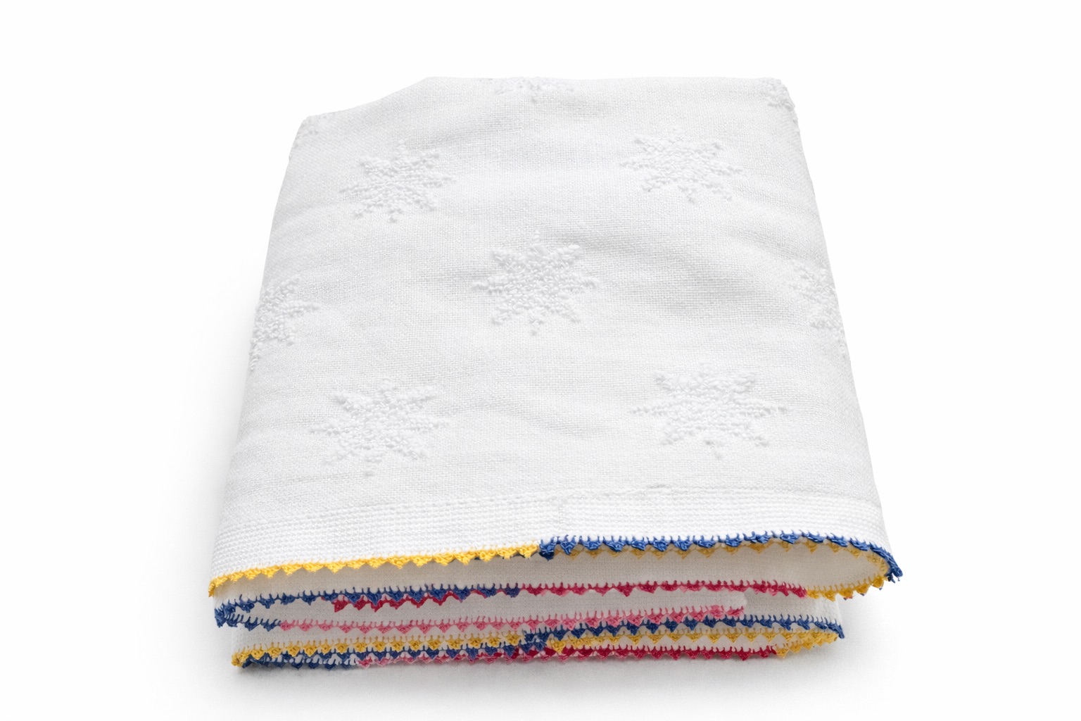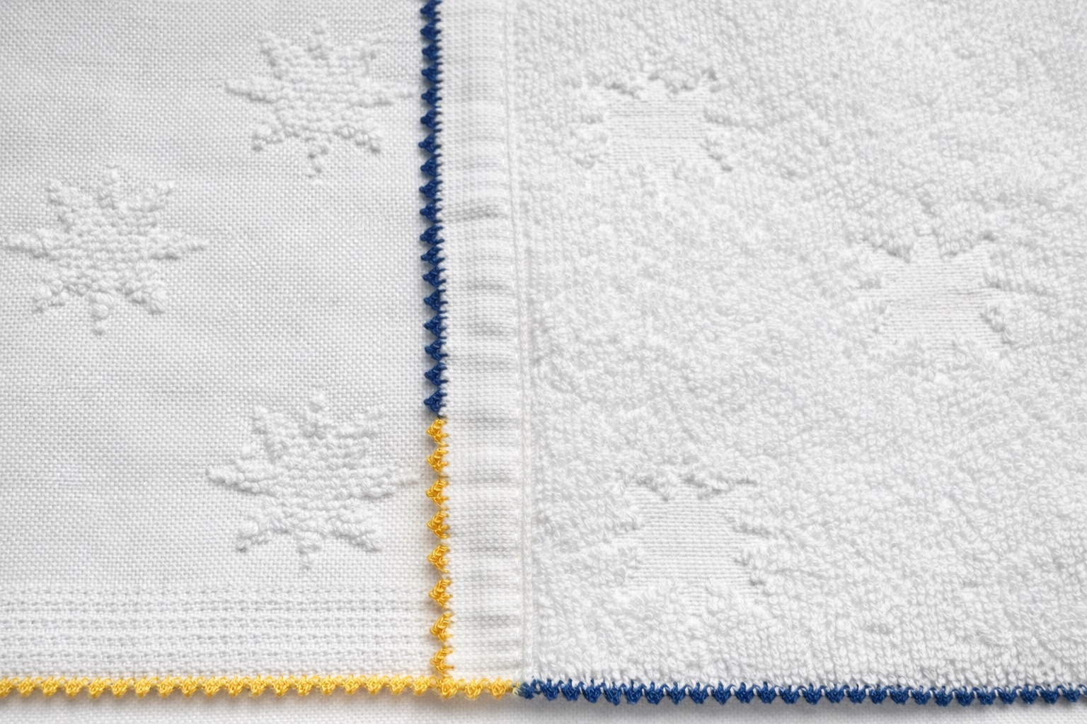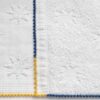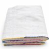 La finition est souligné par un point de derss coloré réalisé à la main, mêlant bleu profond, jaune safran et rose framboise Cet encadrement apporte une touche lumineuse et graphique à cette serviette à la fois sobre et singulière.