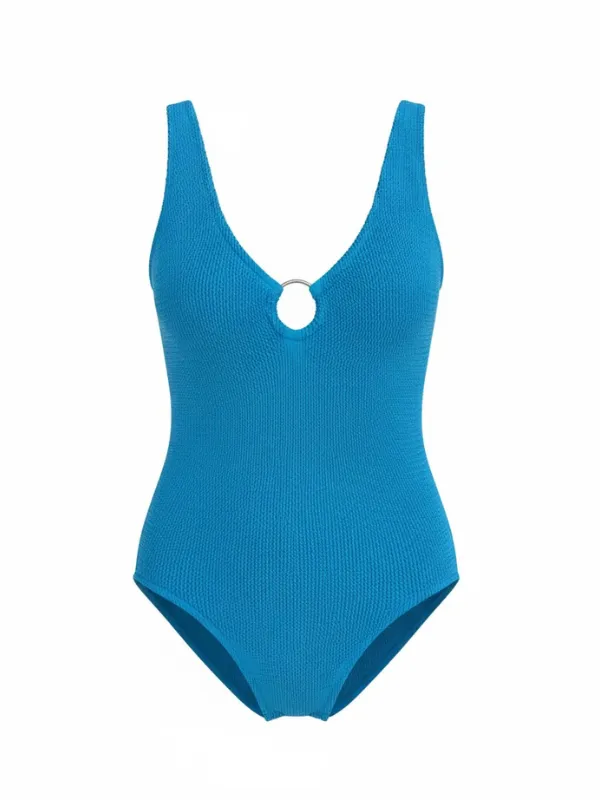 Grâce à notre tissu extensible emblématique, le maillot s’ajuste naturellement aux formes du corps, offrant maintien et confort sans compromis. Sa texture souple épouse les courbes, valorise toutes les silhouettes et s’adapte à une large gamme de tailles — sans jamais se déformer.