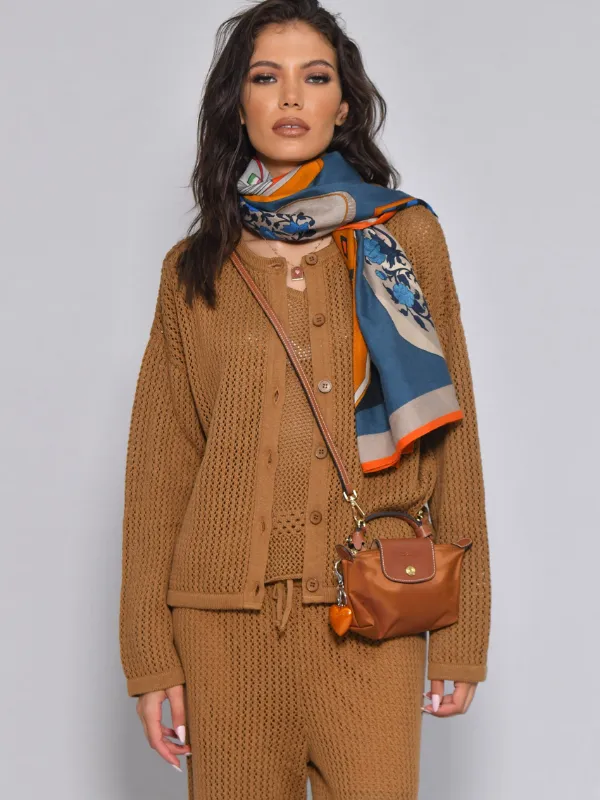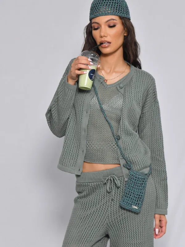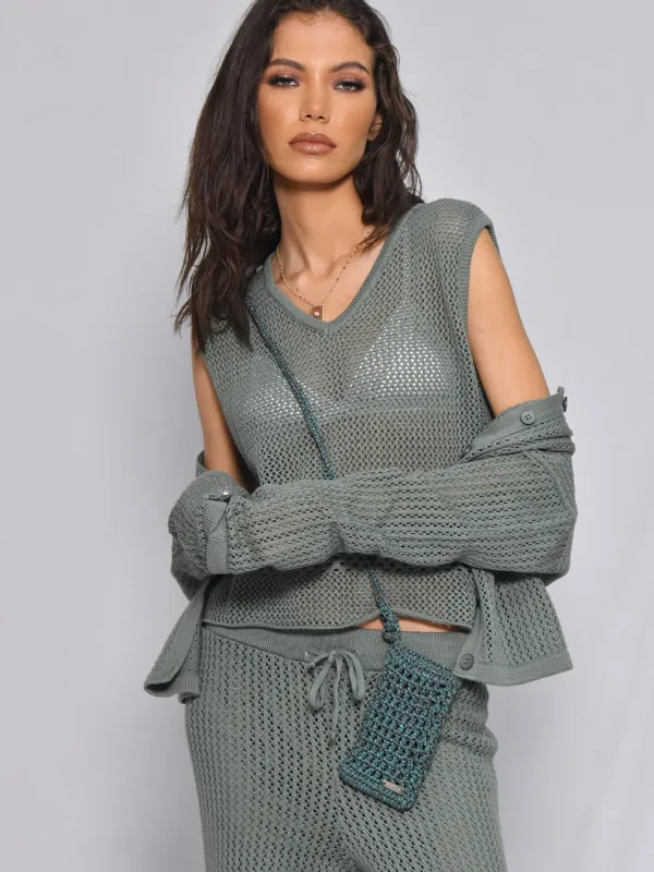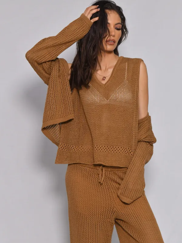 MOON est un ensemble en maille ajourée composé d’un cardigan, d’un top assorti et d’un pantalon à la coupe fluide.