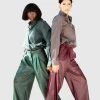 Ce pantalon oversize en éco-cuir stretch séduit par sa coupe ample et sa couleur bordeaux intense.