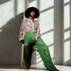 Pantalon oversize en tissu vert pailleté, au tombé fluide et lumineux, offrant une allure moderne et audacieuse.