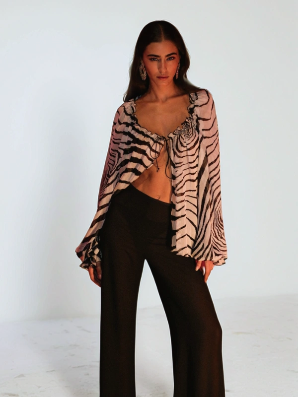 Pantalon évasé en mousseline de soie noire et translucide, qui semble flotter dans les airs tout en conservant son tombé somptueux.