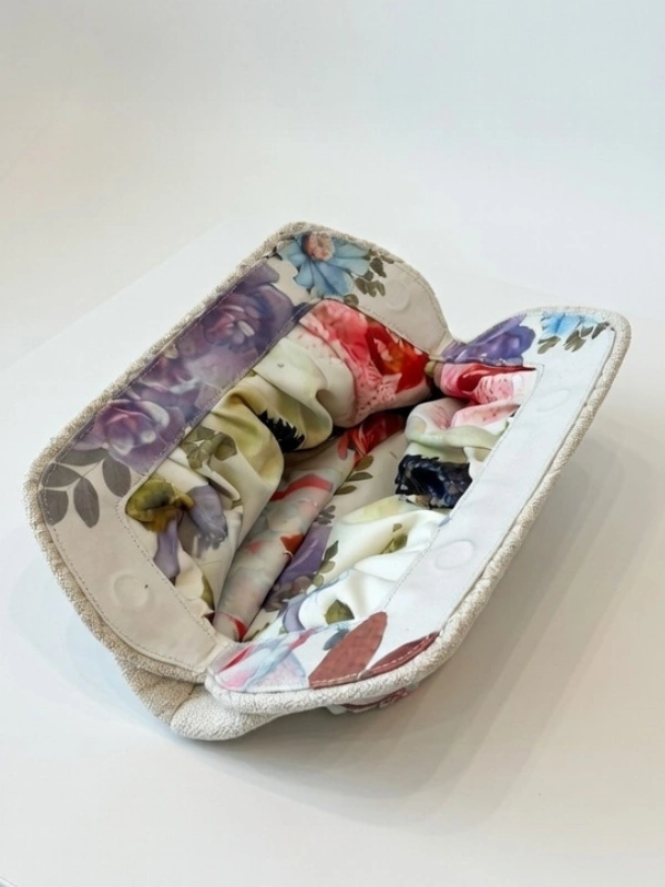Pochette élégante beige sable avec texture douce et effet plissé, parfaite pour un look chic et naturel.