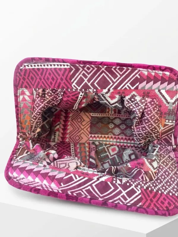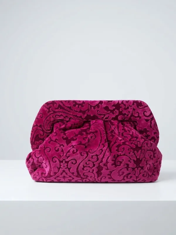 Grande pochette en velours fuchsia aux motifs arabesques en relief avec une silhouette souple et élégamment plissée.
