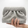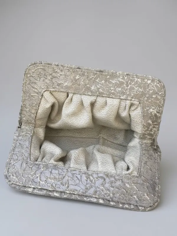 Cette pochette moyenne est réalisée dans une matière texturée aux motifs délicatement craquelés, dans un ton gris argenté lumineux et raffiné. Sa silhouette souple et plissée, associée à une large poignée intégrée, lui confère un style sophistiqué et contemporain parfait pour les occasions spéciales.