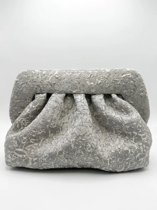 Pochette moyenne grise en tissu texturé effet jacquard avec une forme plissée moderne et une poignée structurée élégante.