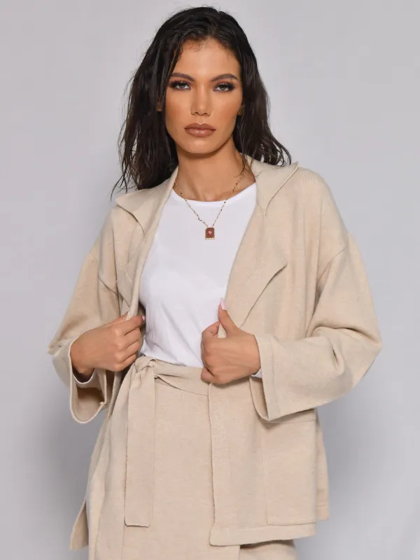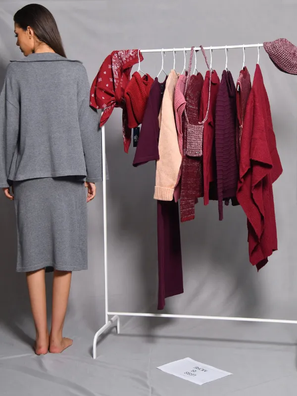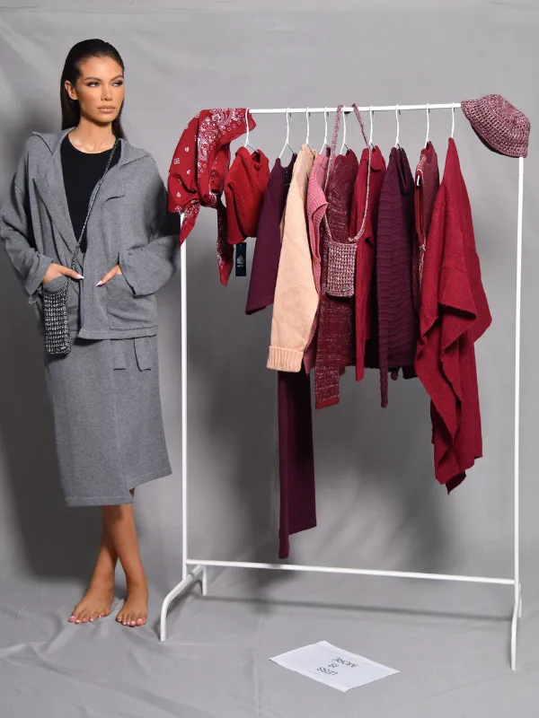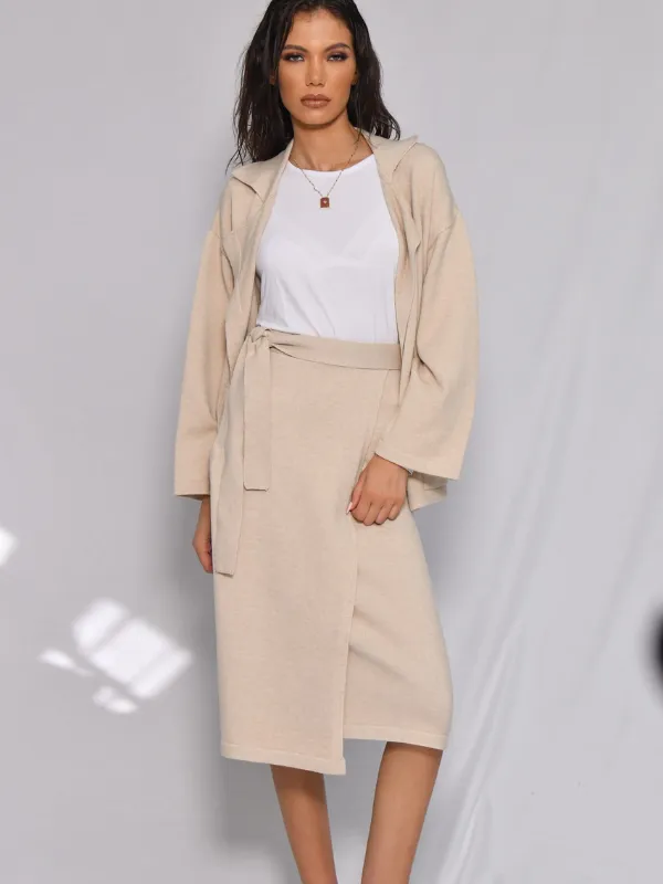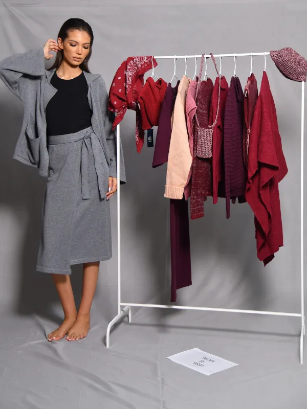 Composé d’un cardigan à la coupe décontractée et d’une jupe midi assortie, il offre un confort absolu et une silhouette épurée.