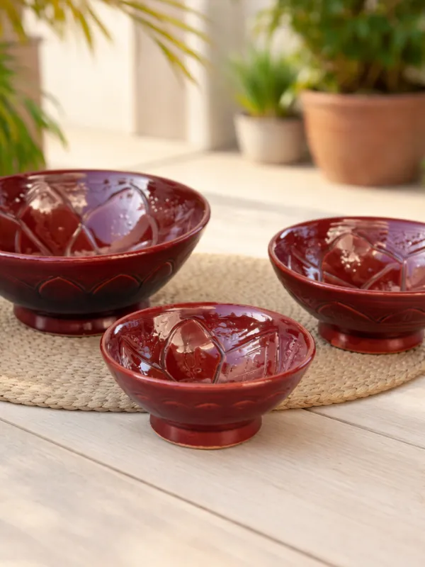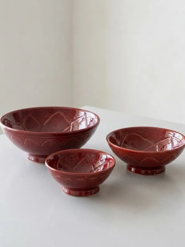 Le saladier TIZWELT bordeaux est une pièce de céramique artisanale marocaine, façonnée et émaillée à la main selon un savoir-faire traditionnel. Sa forme généreuse, son pied discret et son décor délicatement embossé apportent caractère et élégance à la table.