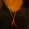 Collier sautoir composé d’une double chaîne dorée et orné d’un pendentif en forme de branche de corail rouge, maintenu par un fil métallique doré finement enroulé autour du haut du pendentif.
