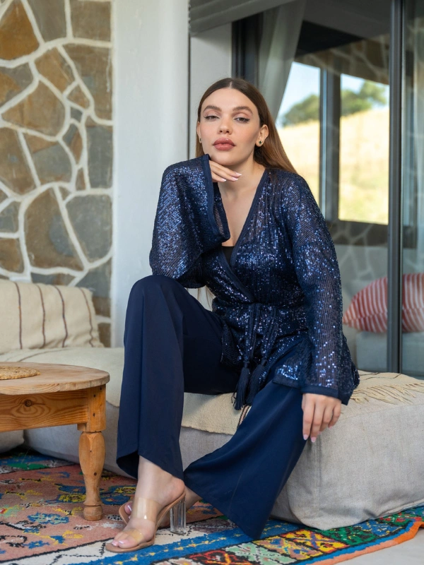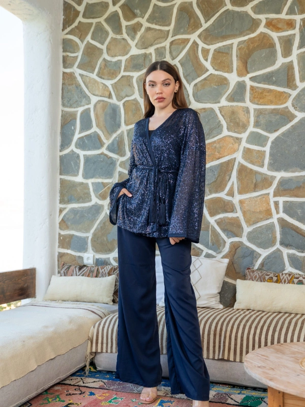 Ensemble bleu marine à sequins, élégant et décontracté, alliant confort et style.