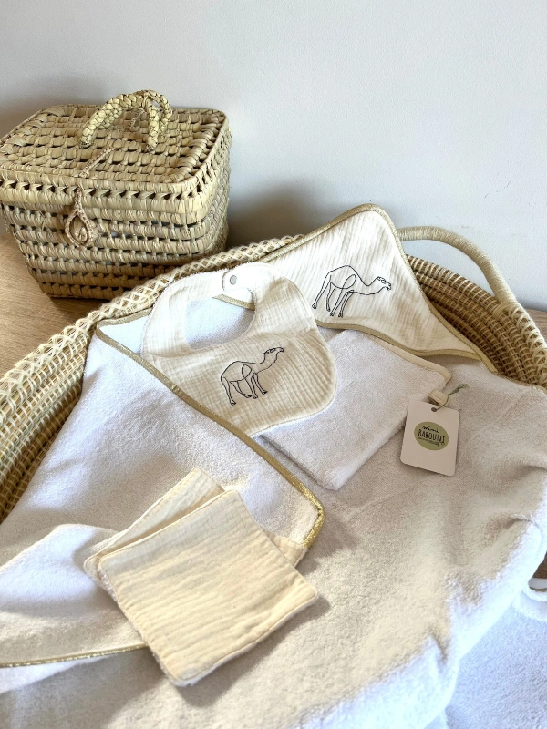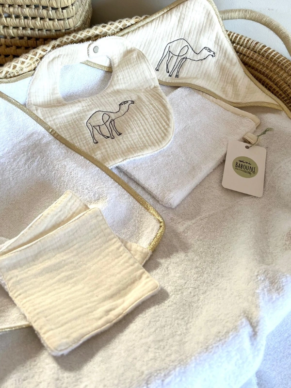 La sortie de bain et le bavoir sont ornés d’un dromadaire brodé.