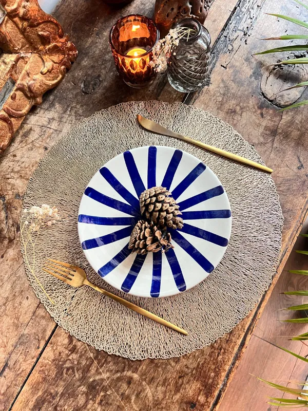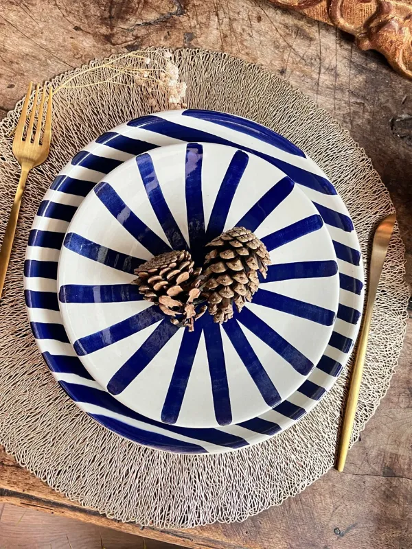 Notre vaisselle artisanale rayée apporte une touche vive et naturelle à votre table grâce à son motif peint à la main.