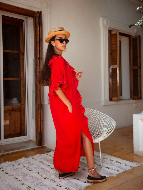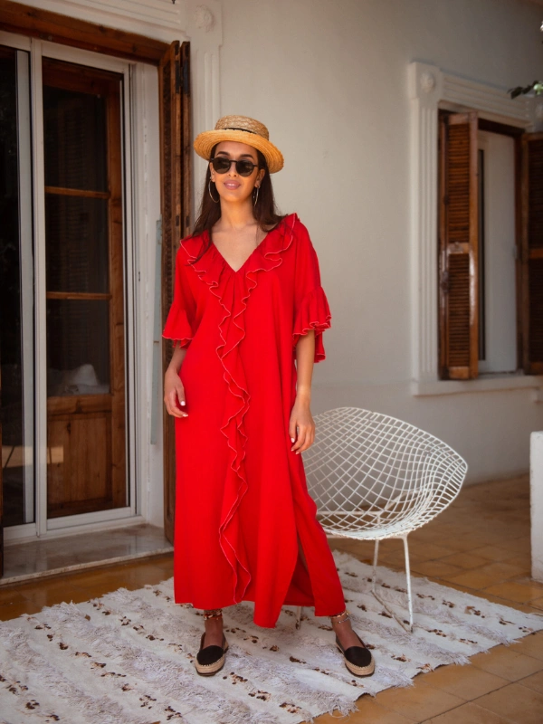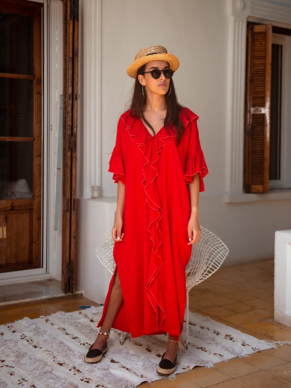 Un caftan long et fluide en lin, sublimé par des manches à volants pour un style à la fois élégant et décontracté.
